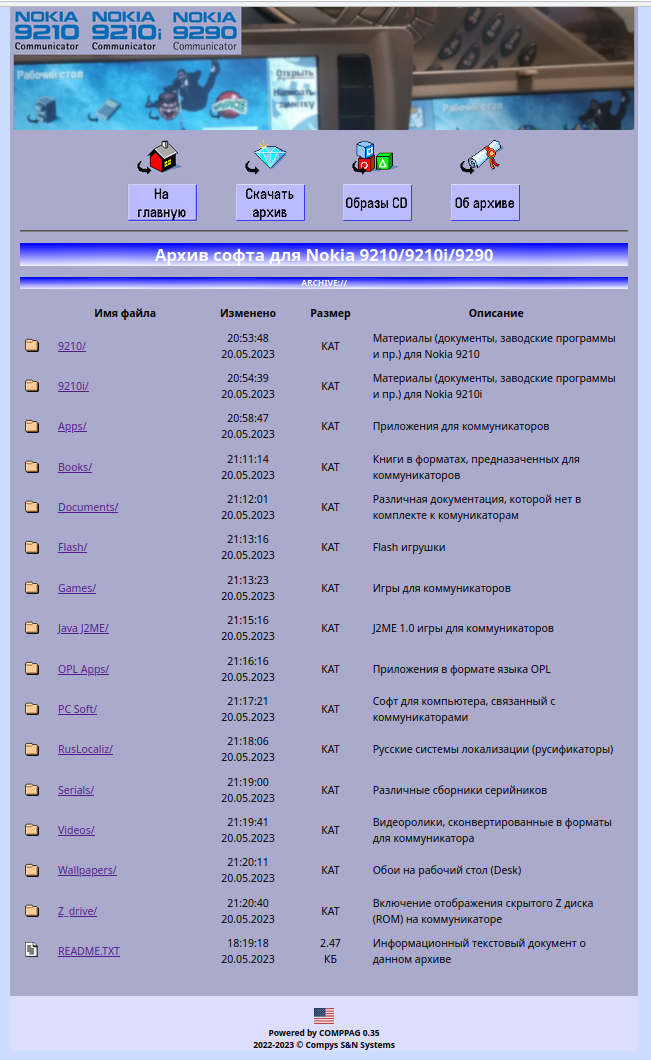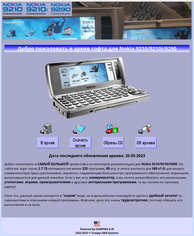 :: Главная bs0dd.net :: Гостевая книга :: FAN-сайт Nokia Phones :: :: Электроника МК :: Архив Nokia 92xx :: Kannel для Windows :: -- Switch to English -- Новость №4СПИСОК Открытие подсайта-архива с софтом для Nokia 92xxОткрылся онлайн архив софта для Nokia 92xx Communicator. Была проделана солидная работа по сортировке, фильтрованию и упорядочиванию контента с нескольких софт-коллекций, полученных от разных людей. Буду рад, если кто-то поделится со мной отуствующими в архиве приложениями и иными материалами.
