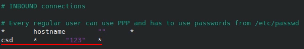После ввода команды программа запросит пароль для пользователя (при этом он не виден на экране). Затем нужно повторно ввести его для подтверждения корректности. Редактируем настройки авторизации pppd: